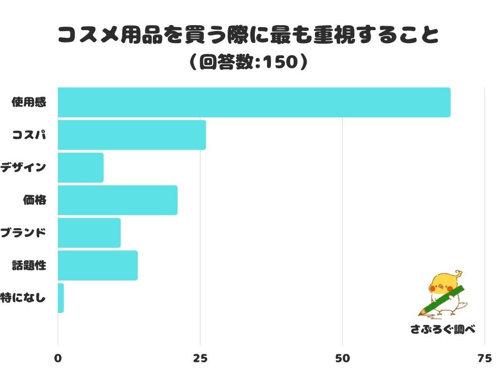 コスメ用品を買う際に最も重視することをアンケートにて調査したところ、1位は「使用感」でした。