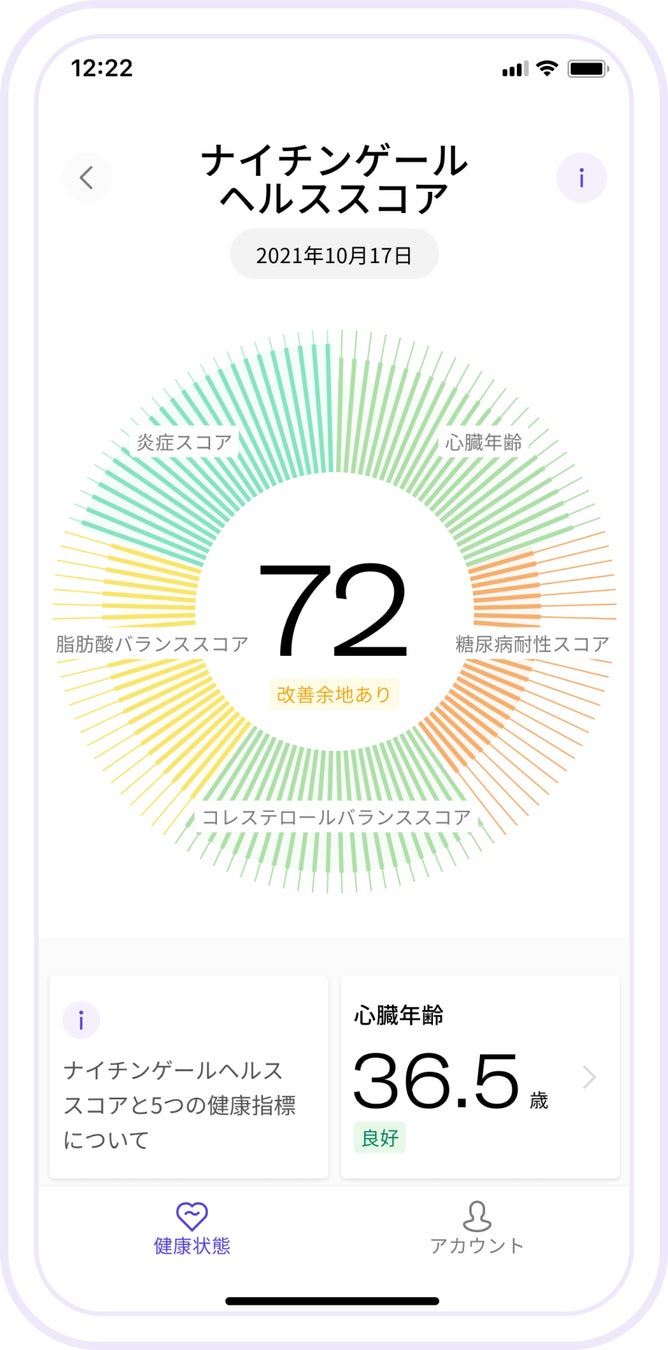 マイ ナイチンゲールはフィンランドの予防医療企業Nightingale Health社が保有する革新的な血液分析技術を用いて、血液健康スコアと生活習慣病の将来のリスクを見える化するサービスです。少量の血液から250項目を分析し、100点満点の血液健康スコアを算出します。加えて、健康診断や人間ドックだけでは分からない将来の生活習慣病のリスクも評価します。血液健康スコアを5つの健康指標に分けて分析し、それぞれの指標を効果的に改善する生活習慣アドバイスを提供します。特に取り組むべき行動が絞り込まれるので、生活改善が続けやすくなります。