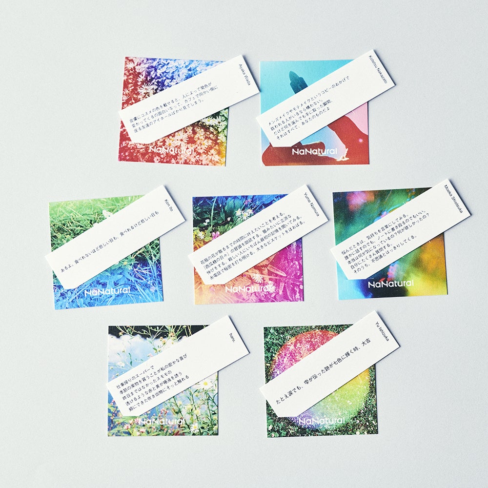 7月16日(土)より全国ロフトで開催される「ロフト サステナブルビューティー」参画ブランドとして『7NaNatural』をロフト23店舗にて取り扱い開始致します。店頭では、7人のアーティストによる言葉で、個性や価値観、今日の気持ちをエンパワーし、“ナナイロ”のインスピレーションを与えてくれる『ななみくじ』を設置。色とりどりのインスピレーション、言葉たちに背中を押されて、“すきな色を選び、纏う”という体験を創出します。 ※ななみくじは店頭什器の一角に設置し(無料配布)、なくなり次第終了となります。
