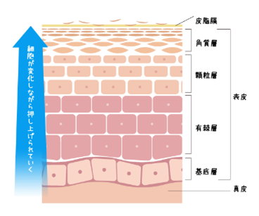 ターンオーバーが行われる表皮では、肌の内側から日々新しい細胞が生まれ、成長しながら肌の表面(角質層)へ押し上げられ、最後は垢となってはがれ落ちます。