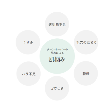 シワ、くすみ、たるみ、、、さまざまな肌悩みの大きな原因の一つには、肌のターンオーバーが関係していると言われています。ターンオーバーとは肌の生まれ変わり、つまり皮膚の代謝サイクルです。