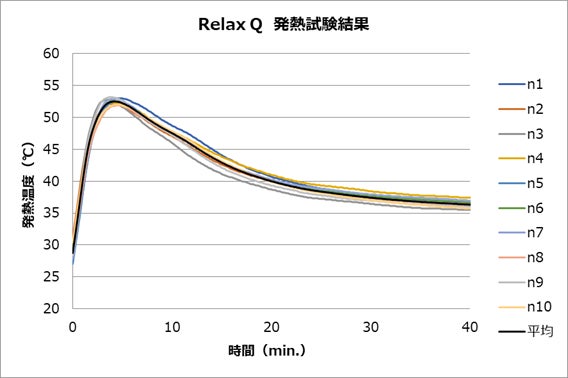 発熱持続時間はおおよそ15分程度、肌に貼ってからすぐに発熱が始まります。温度と持続時間の関係は、以下のグラフをご覧ください。