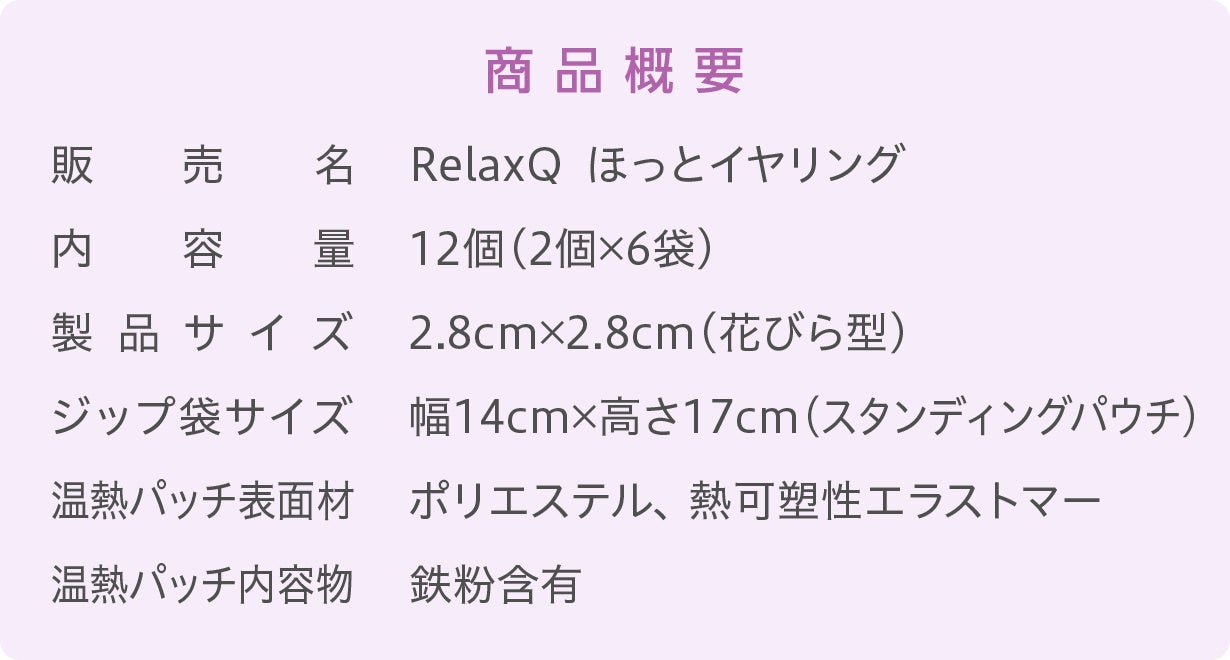 集まり、疲れ目や美肌のポイントが多い事に着目して、最適な温かさの検討を重ねて「Relax Qほっとイヤリング」が完成しました。