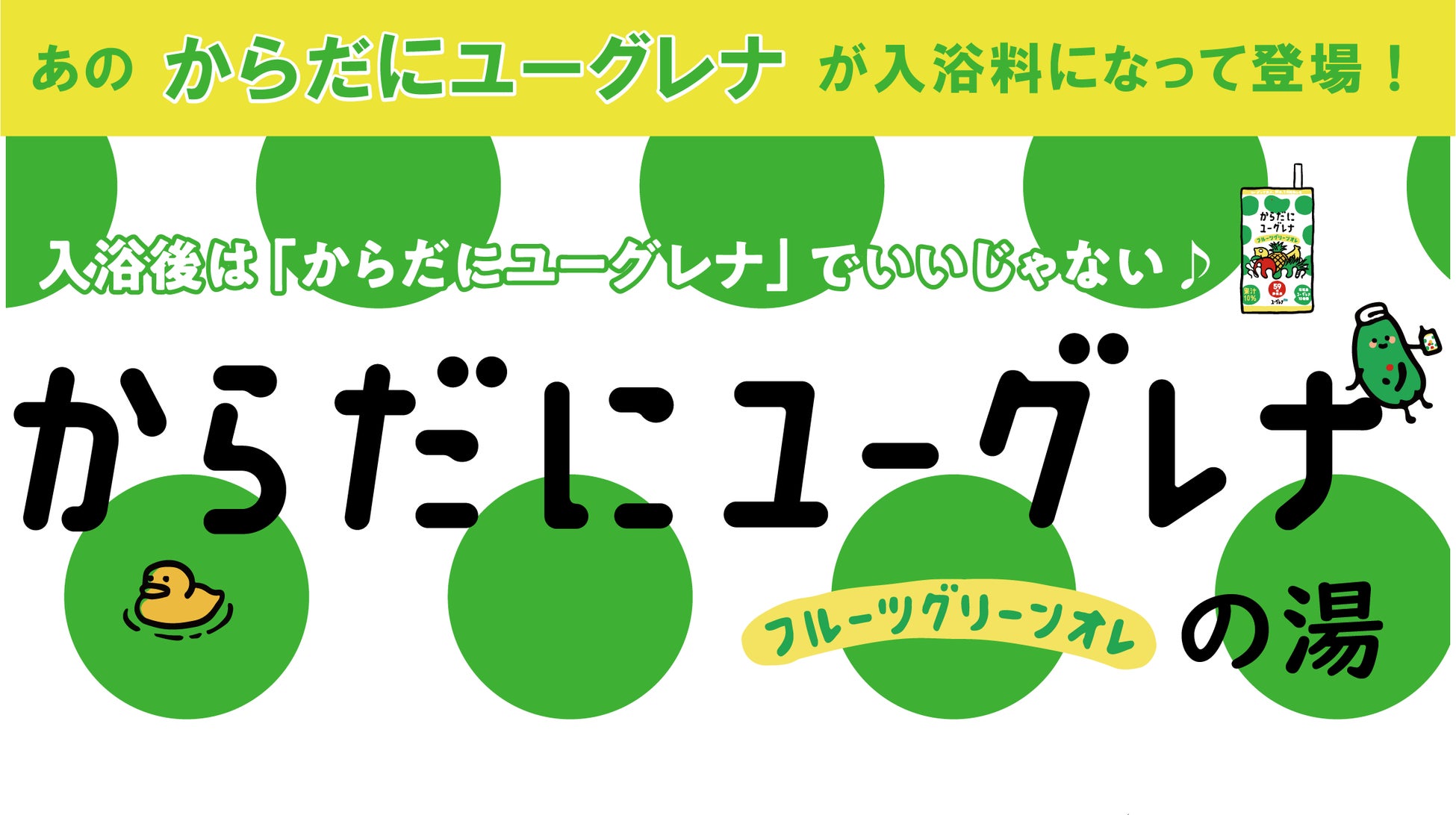 なお、ドリンクの「からだにユーグレナ フルーツグリーンオレ」は、人間に必要な59種類の栄養素をバランス良く含む石垣島ユーグレナ10億個(約1,000mg)を配合した飲料です。栄養素を体内に届け、栄養を巡らせ健康の土台を整えることで、まもるチカラを支え、カラダの根本からアプローチします。入浴も同様に、心身共に健康を保持増進するために取り組んでいる人が多く、「からだにユーグレナ」を美味しく楽しく入浴後に取り入れることで、心身共に「サステナブる」な健康を目指します。