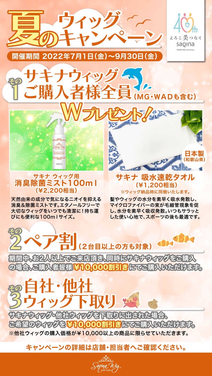 - サキナウィッグご購入者全員にサキナウィッグ用消臭除菌ミスト&サキナ吸水速乾タオルをプレゼント
