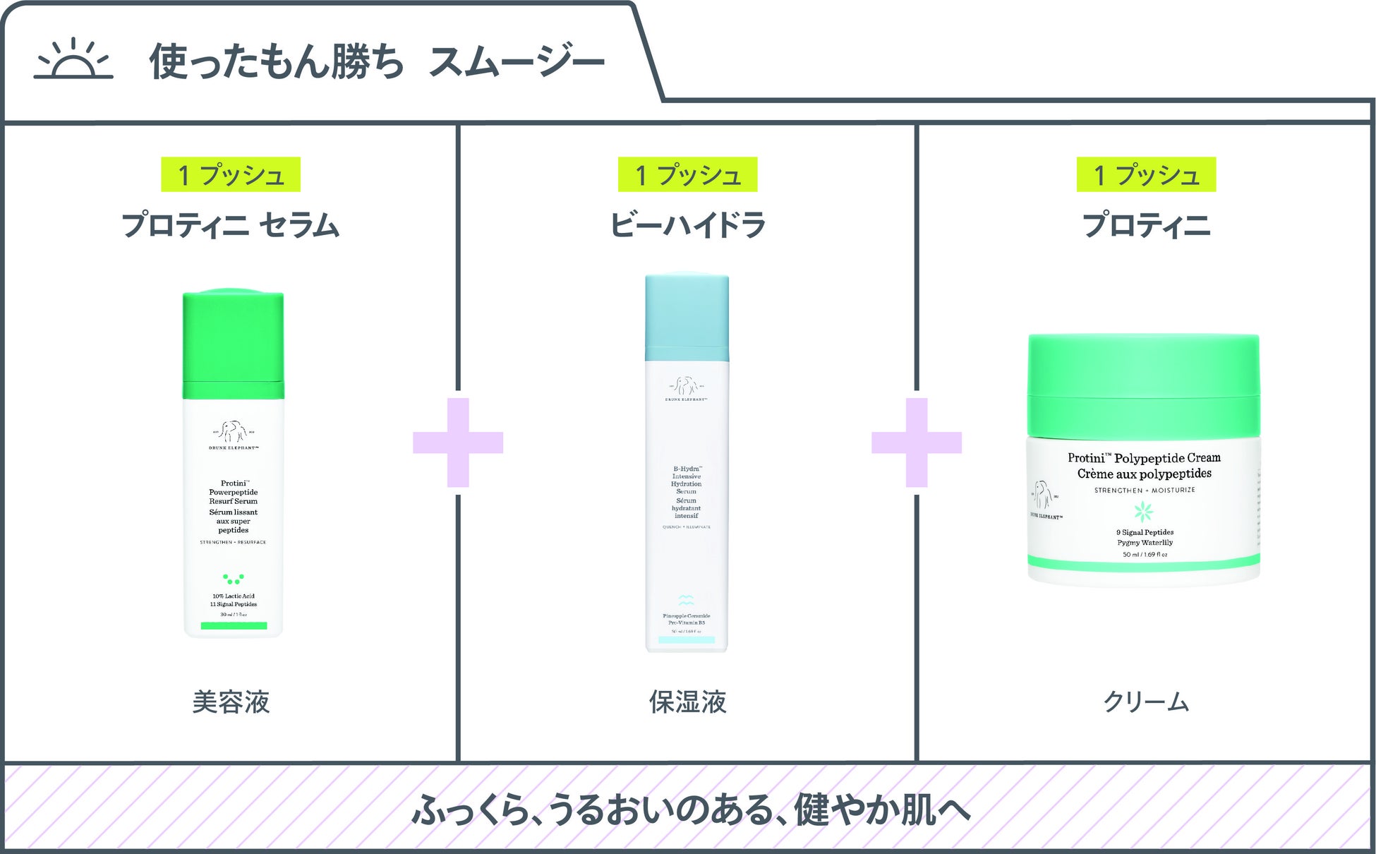 お肌の水分&油分バランスを保ちながら、夏のお疲れ感を感じさせない、なめらかぷるんと弾むような肌に導くためにおすすめなのが、プロティニシリーズ。ドランク エレファントの「プロティニ ポリペプチド クリーム」と「プロティニ P ペプチド リサーフセラム」には、複数種のペプチドを配合し、朝晩のケアに取り入れることで、ふっくらなめらか、ぷるんとしたハリのある肌へ導きます。単品使いで毎日のお手入れにクリーム・セラムとして取り入れて頂いても効果を実感頂けますが、ドランク エレファントの魅力をさらに体験頂くには、#手のひらスムージー 使いがおすすめ。