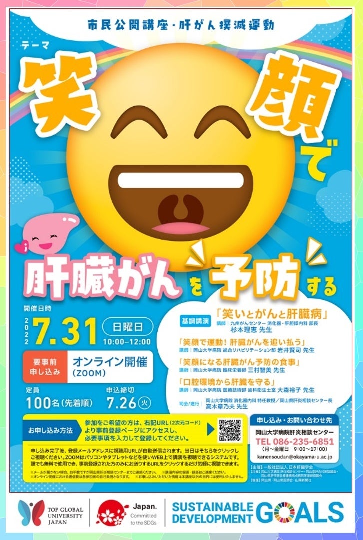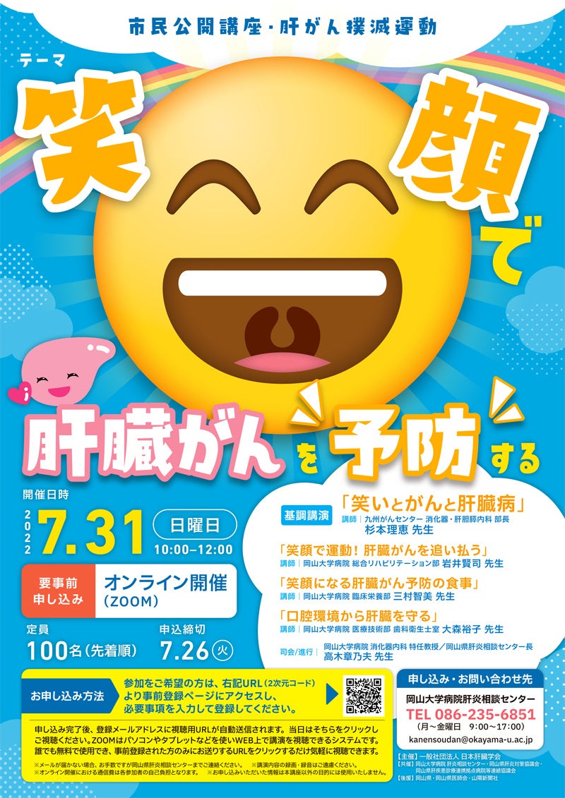 国立大学法人岡山大学(本部:岡山市北区、学長:槇野博史)の岡山大学病院では、一般社団法人日本肝臓学会主催に共催し、2022年7月31日(日)に市民公開講座「肝がん撲滅運動 笑顔で肝臓がんを予防する」をオンラインで開催します。