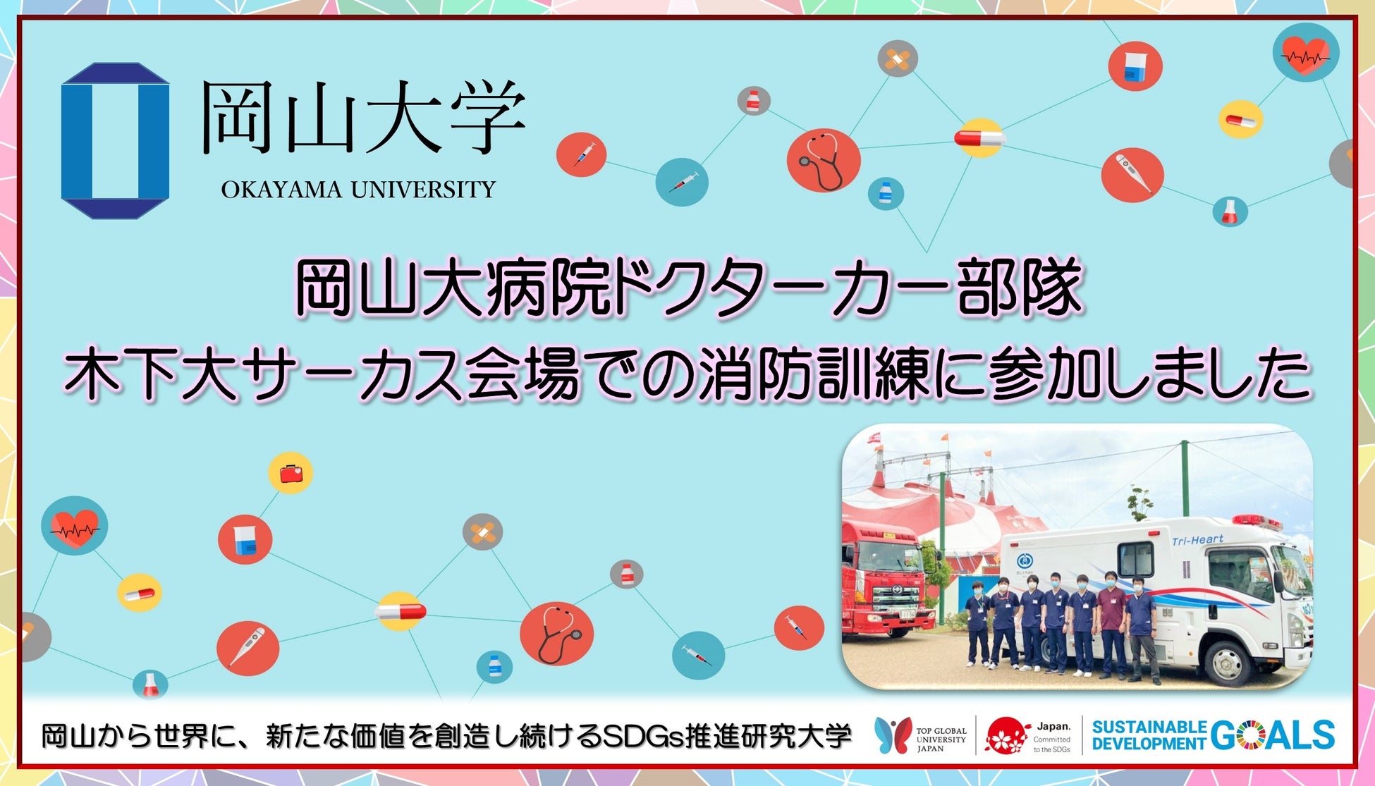 国立大学法人岡山大学(本部:岡山市北区、学長:槇野博史)の岡山大学病院は、2022年7月4日(月)に「木下大サーカス岡山公演」の会場で行われた消防訓練に「岡山大学病院ドクターカー部隊」も参加しました。