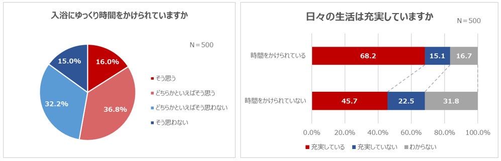 また、日々の生活の充実感で比較してみたところ、「時間をかけられている」と回答した人のうち、日々の生活が「充実している」と答えた人は68.2%だったのに対し、「時間をかけられていない」という人は45.7%という結果になりました。入浴は心身だけでなく、生活の充実度においても重要な役割があるようです。