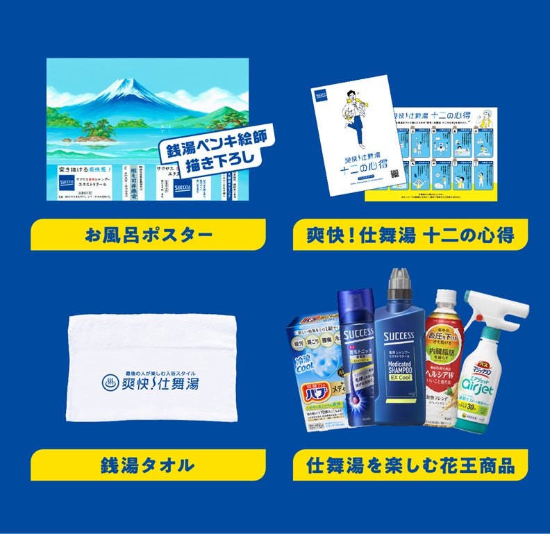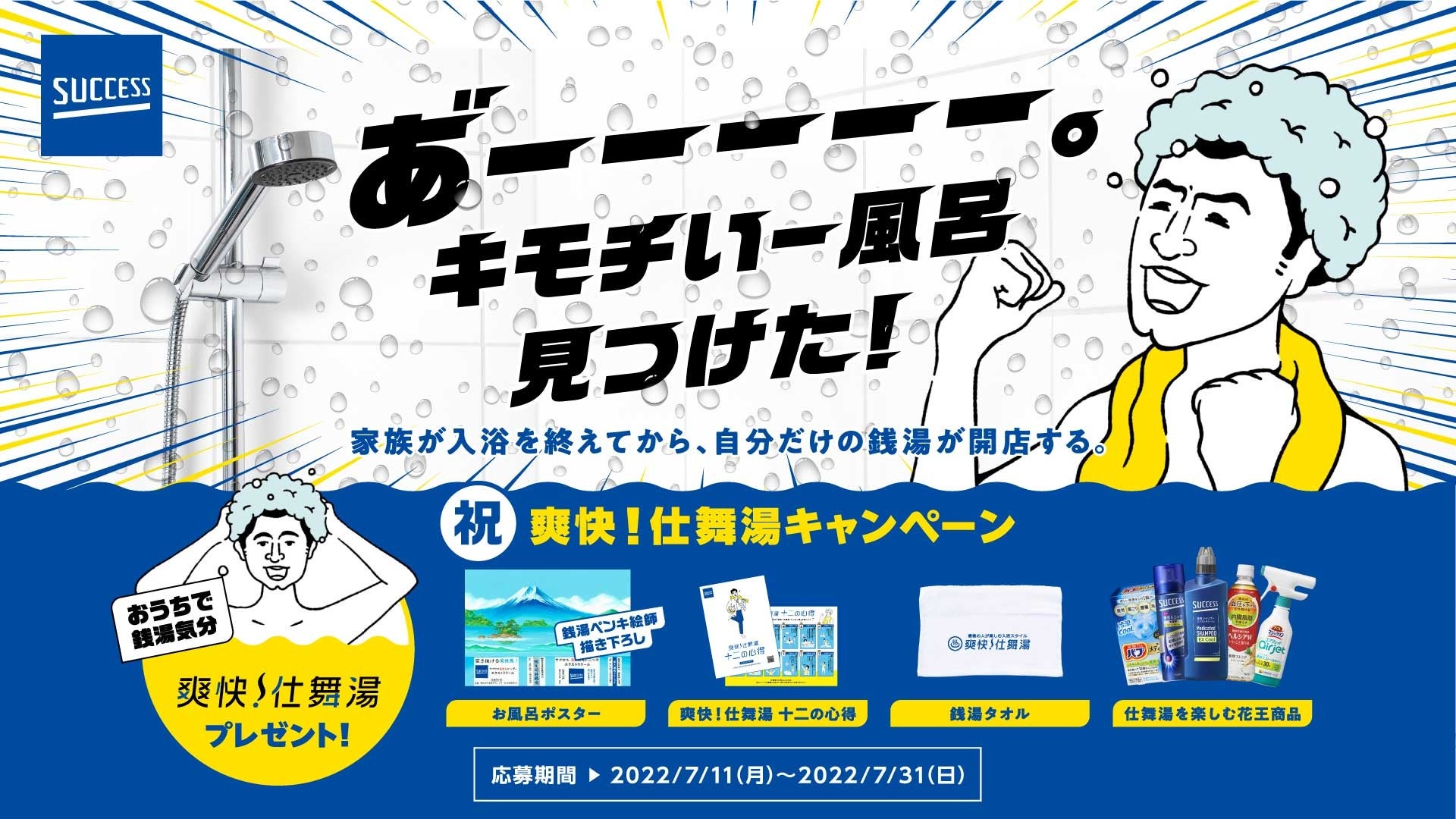 サクセスは一番最後に入浴する「仕舞湯」を楽しむための「爽快!仕舞湯プレゼント」が当たるキャンペーンを2022年7月11日(月)より実施します<締切7月31日(日)>。サクセスをはじめとした仕舞湯を楽しむ花王商品や、銭湯ペンキ絵師描き下ろしのオリジナルポスター、爽快!仕舞湯十二の心得などを詰め込みました。是非応募して、最後に入るお風呂を最大限楽しんでみてはいかがでしょうか。