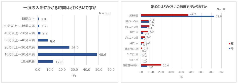入浴時間は「10分以上~20分未満」が最多。入浴で感じる効果「リラックスできる」