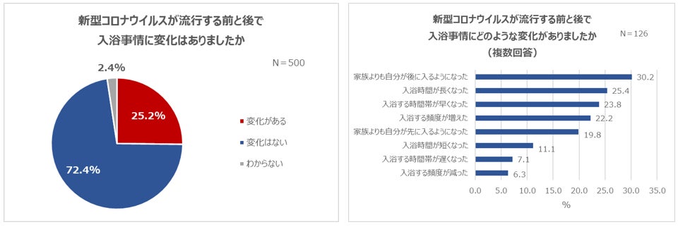 続いては、新型コロナウイルス流行前と後での変化について探りました。入浴事情に変化があったか聞くと、4人に1人が変化があると答えました。具体的には、「家族よりも自分が後に入るようになった(30.2%)」「入浴時間が長くなった(25.4%)」「入浴する時間帯が早くなった(23.8%)」「入浴する頻度が増えた(22.2%)」という変化が見受けられました。