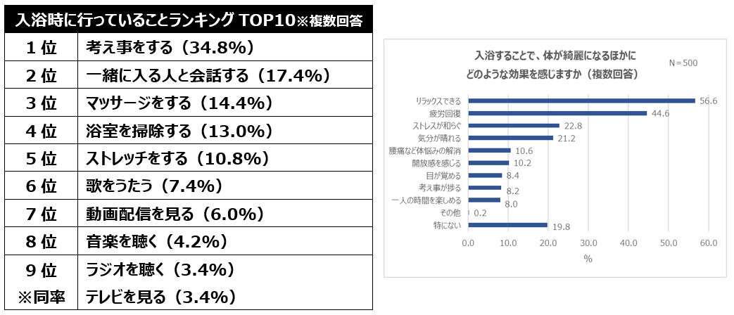 入浴時に体を洗うほかに行っていることについてランキングにしたところ、1位は「考え事をする(34.8%)」、2位は「一緒に入る人と会話する(17.4%)」、3位は「マッサージをする(14.4%)」という結果になり、自分自身と向き合ったり人と会話をしたりする場所として、入浴時間を活用している人が多い傾向がうかがえました。また、入浴時にどのような効果を感じるか聞いてみたところ、過半数が「リラックスできる(56.6%)」と回答。「疲労回復(44.6%)」や「ストレスが和らぐ(22.8%)」などの回答も多く、入浴時間は心身ともに安らげる時間と言えそうです。