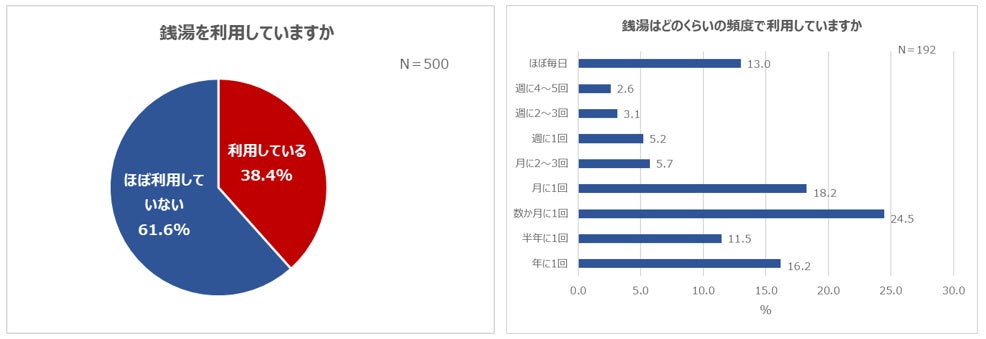 まず、銭湯を利用しているかについて聞いたところ、「利用している(38.4%)」と、3人に1人が銭湯を利用していることが判明。利用している人の頻度は「数か月に1回(24.5%)」が最多で、「月に1回(18.2%)」「年に1回(16.2%)」と続きました。日常使いではなく、銭湯の特別感を楽しむ目的で利用する人が多いのかもしれません。