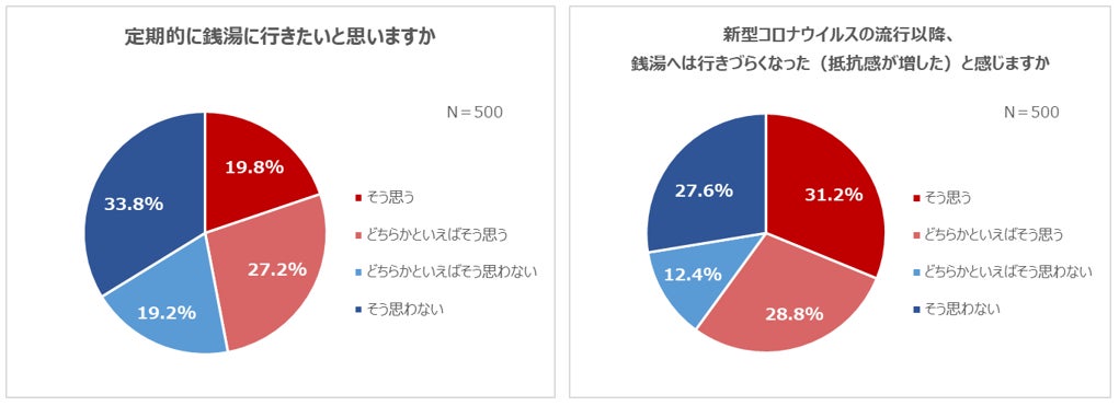 また、定期的に銭湯に行きたいかという質問に対しては、銭湯をほぼ利用していない人も含めて約5割が「そう思う(19.8%)」「どちらかといえばそう思う(27.2%)」と答え、あまり利用していない人でも銭湯への意欲があることがうかがえました。しかし、新型コロナウイルスの流行以降、銭湯へは行きづらくなった(抵抗感が増した)という人は「そう思う(31.2%)」「どちらかといえばそう思う(28.8%)」を合わせて約6割でした。