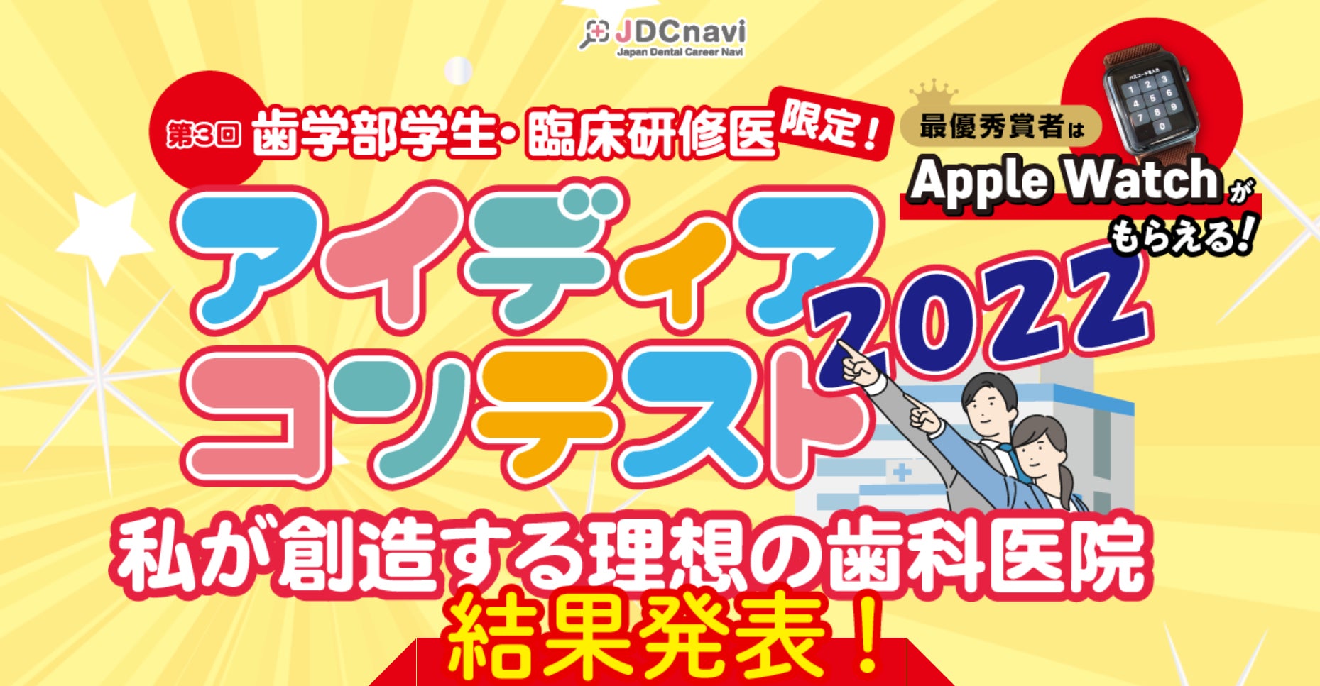 歯学部学生・臨床研修医のための臨床研修施設・就職情報サイト「JDC navi」(JDCは、Japan Dental Careerの略)では、2022年2月15日から5月9日まで、第3回 歯学部学生・臨床研修医限定のアイディアコンテストを開催しました。「私が創造する理想の歯科医院」をテーマに募集し、7月10日、最優秀賞、優秀賞、奨励賞が決定しました。