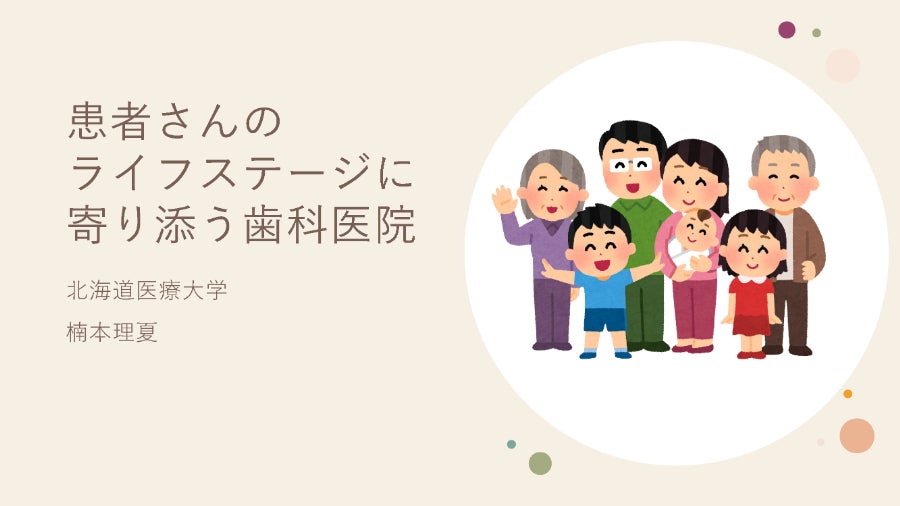 最優秀賞に輝いたのは、北海道医療大学6年 楠本理夏(くすもとりか)さんの、「患者さんのライフステージに寄り添う歯科医院」のアイディア。