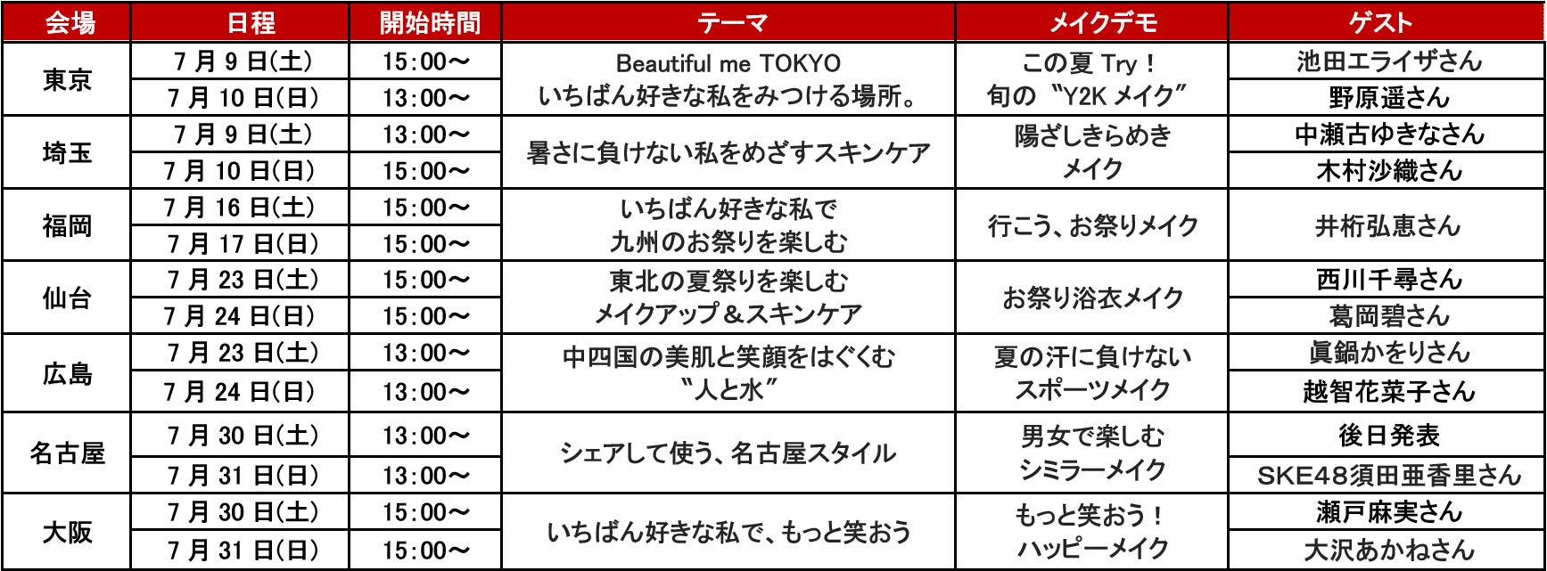 7月16日(土)・17日(日)の福岡会場にはアクアレーベル広告モデルの井桁弘恵さん、他会場でもさまざまなゲストが登場します。また、都市ごとのテーマに合わせたメイクデモンストレーションを行います。ステージの模様は、資生堂公式YouTubeチャンネル( https://www.youtube.com/user/SHISEIDOofficial )で同時に配信、同チャンネルと「Beautiful me STATION」デジタル会場でアーカイブ動画を視聴できます。