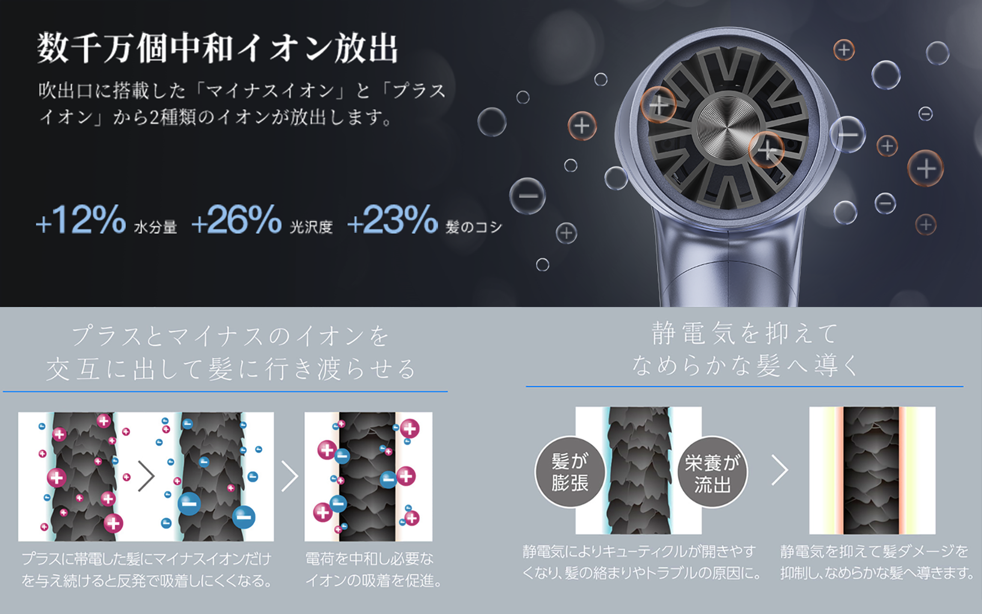 中和イオンはプラスイオンとマイナスイオンが同時に放出する状態の総称です。 プラスとマイナスイオンが同時に髪に付着し、髪週りのイオンがバランスのとれた状態になり、数千万の中和イオンを放出で静電気を95%抑え、髪のキューティクルダメージを抑制し、髪の奥までうるおく、本来のツヤを守ります。髪の毛の根元に深く入り込み、効果的に殺菌し、頭皮の健康を高め、髪の切れを減らすことができます。