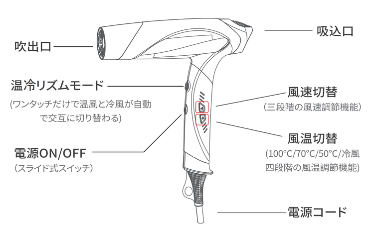 | 仕様・サイズ | 定格電圧:AC100V 定格周波数:50/60Hz 定格消費電力:1400W 温風、温度:50℃、70℃、100℃(室温30℃ 場合) 風速:21m/s コードの長さ:約2.0m 本体重量:約362g 本体サイズ:200x85x50mm |