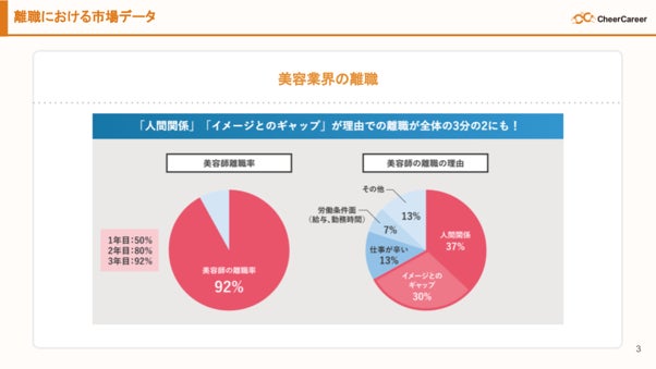 近年は美容師を志望する若手層が減少しています。美容学校の入学者数は平成15年をピークに減少し、倍率1倍以下で定員割れをしてしまう学校が首都圏でも高頻度で発生しています。また、厚生労働省のデータによると、美容師の離職率は1年で50%、3年で80%、10年で92%とかなり高い数値。そのため、全国の美容サロンでは「採用の母集団形成」「採用後の教育」に大きな課題を抱えてしまい、組織の拡大が停滞してしまっているのが現状です。
