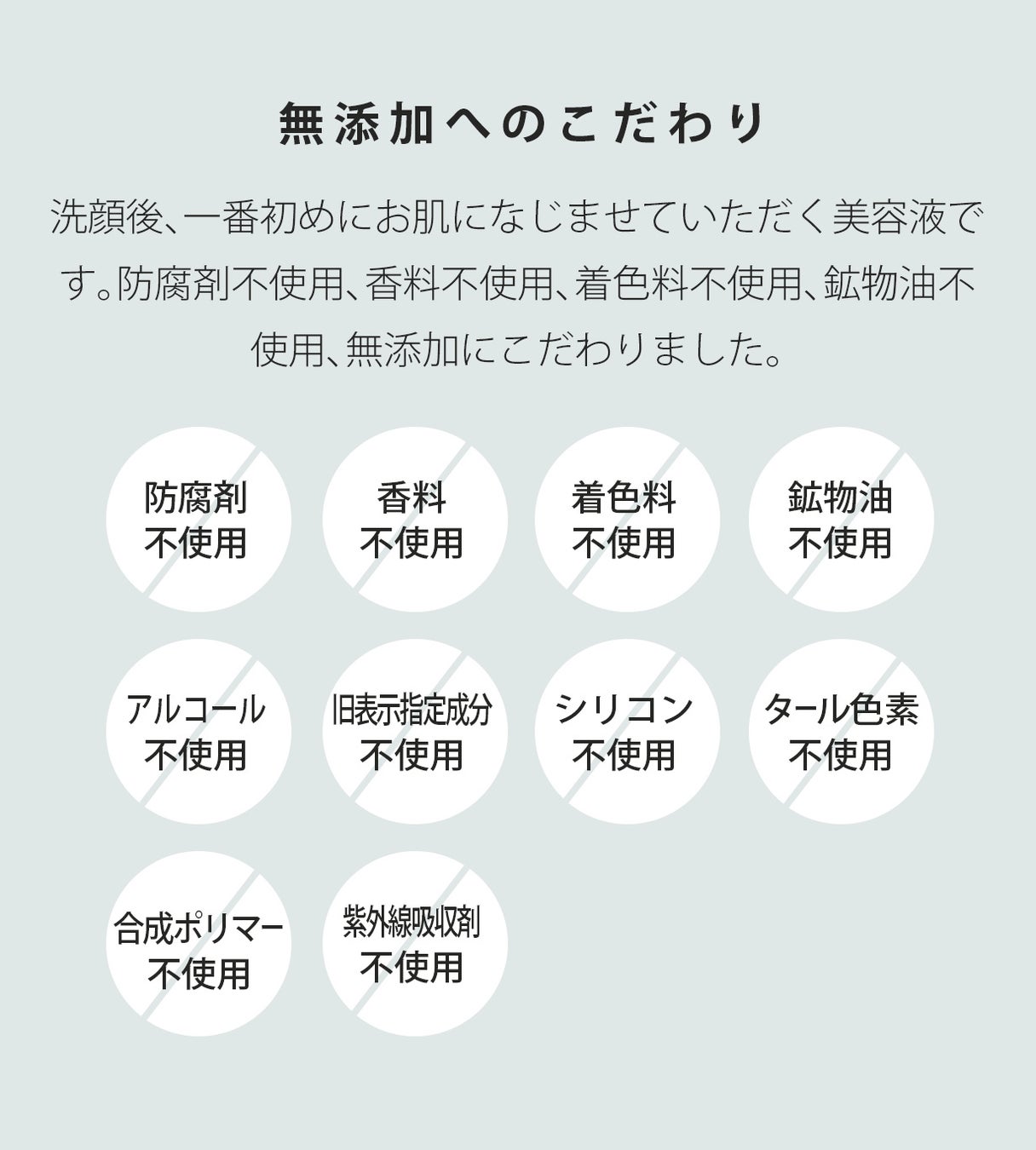 防腐剤不使用(パラベンフリー、フェノキシエタノールフリー)、香料不使用、着色料不使用、鉱物油不使用、アルコール不使用、旧表示指定成分不使用、シリコン不使用、タール色素不使用、合成ポリマー不使用、紫外線吸収剤不使用