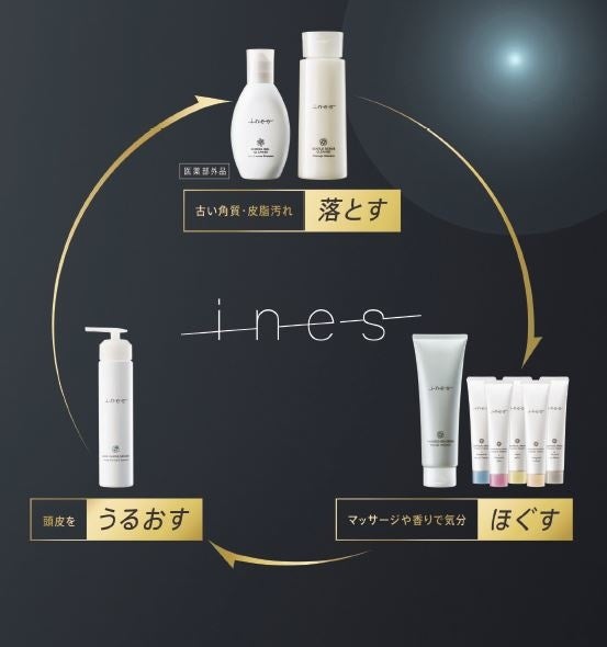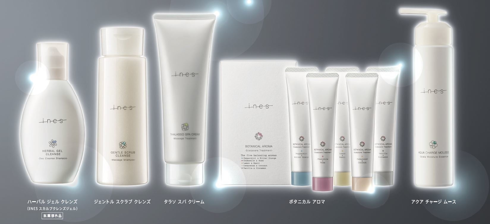inesは、頭皮と顔は一枚の皮膚で繋がっているから、頭皮にも顔と同じような特別なケアが必要という考え方のもと、「汚れを落とす」、「マッサージや香りで気分ほぐす」、「頭皮をうるおす」という3つのサイクル頭皮ケアで、頭皮からはじめるキレイを作るための日々のルーティンをご提案します。古い角質・皮脂汚れを落とす2種類のシャンプー、マッサージしながらうるおいでほぐすトリートメント、香りを選べるトリートメント、お風呂上がりの頭皮をうるおすスカルプ保湿美容液の計5種類のアイテムを取り揃えています。