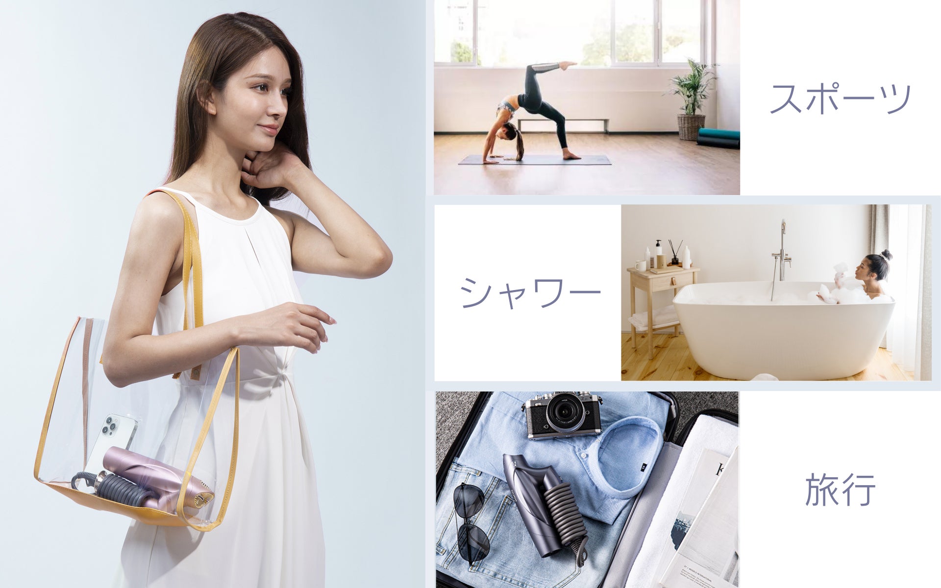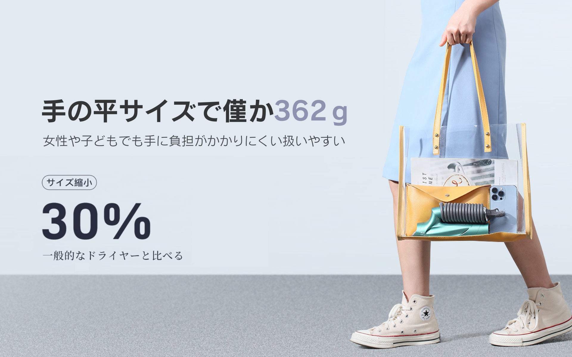 llanoドライヤー本体は僅か362gで(給電ケーブル含まない重量)軽くて長時間使用しても腕が疲れにくいです。しかも簡単に収まる折り畳み式なので、折り畳んだ後のボリュームは傘より短くて、手のひらサイズで付属された収納袋にすっぽり入るコンパクト設計です。