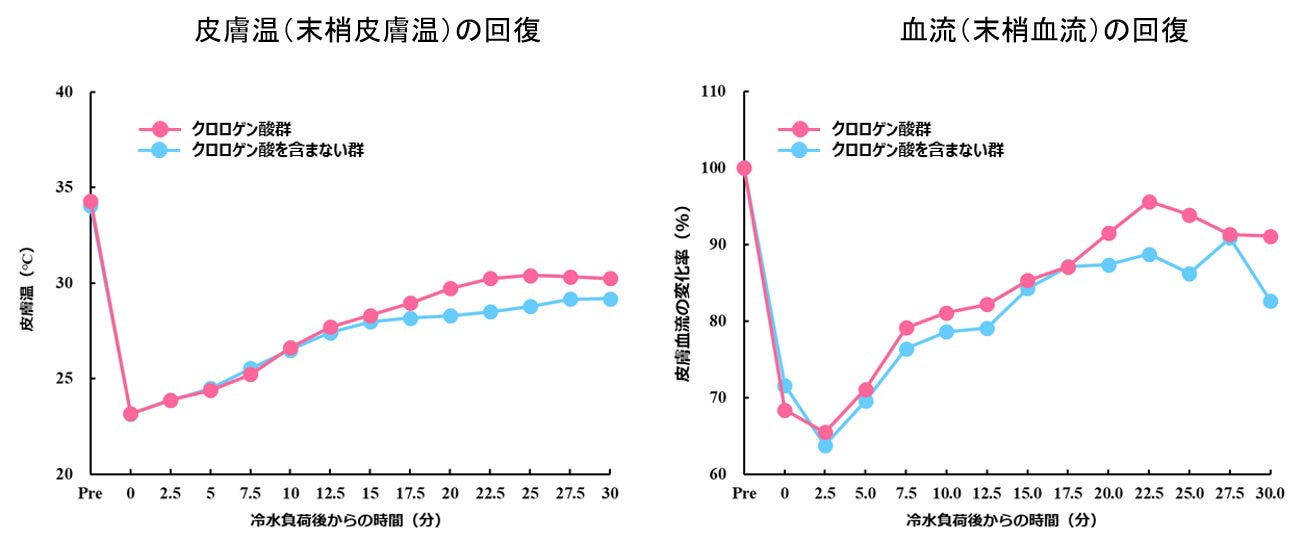 試験方法 :コーヒー豆由来クロロゲン酸270mg(対照群は0mg)を摂取後、50分経った時点で手を15℃の冷水に1分間浸漬させた。その後、手を冷水より出した後30分間の皮膚血流及び皮膚温を計測した。