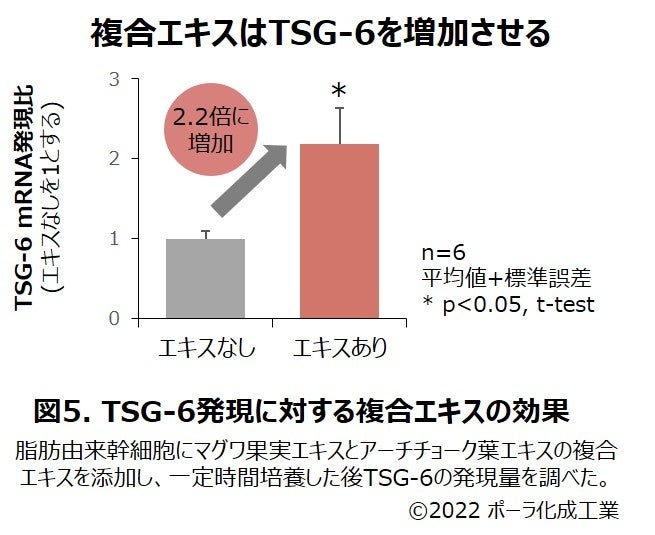 さまざまなエキスを脂肪由来幹細胞に添加した結果、マグワ果実エキスとアーチチョーク葉エキスの複合エキスによって、鍵因子TSG-6の遺伝子発現が2倍以上に増えることを発見しました(図5)。