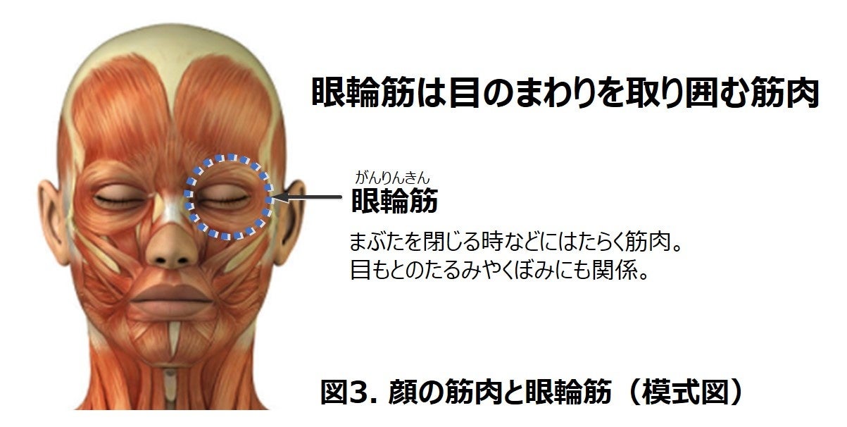 目のまわりに輪状に発達した筋肉が「眼輪筋」です(図3)。まぶたを閉じるはたらきをする筋肉で、目元の印象を左右する「たるみ」や「くぼみ」といった変化との関連性が考えられています。