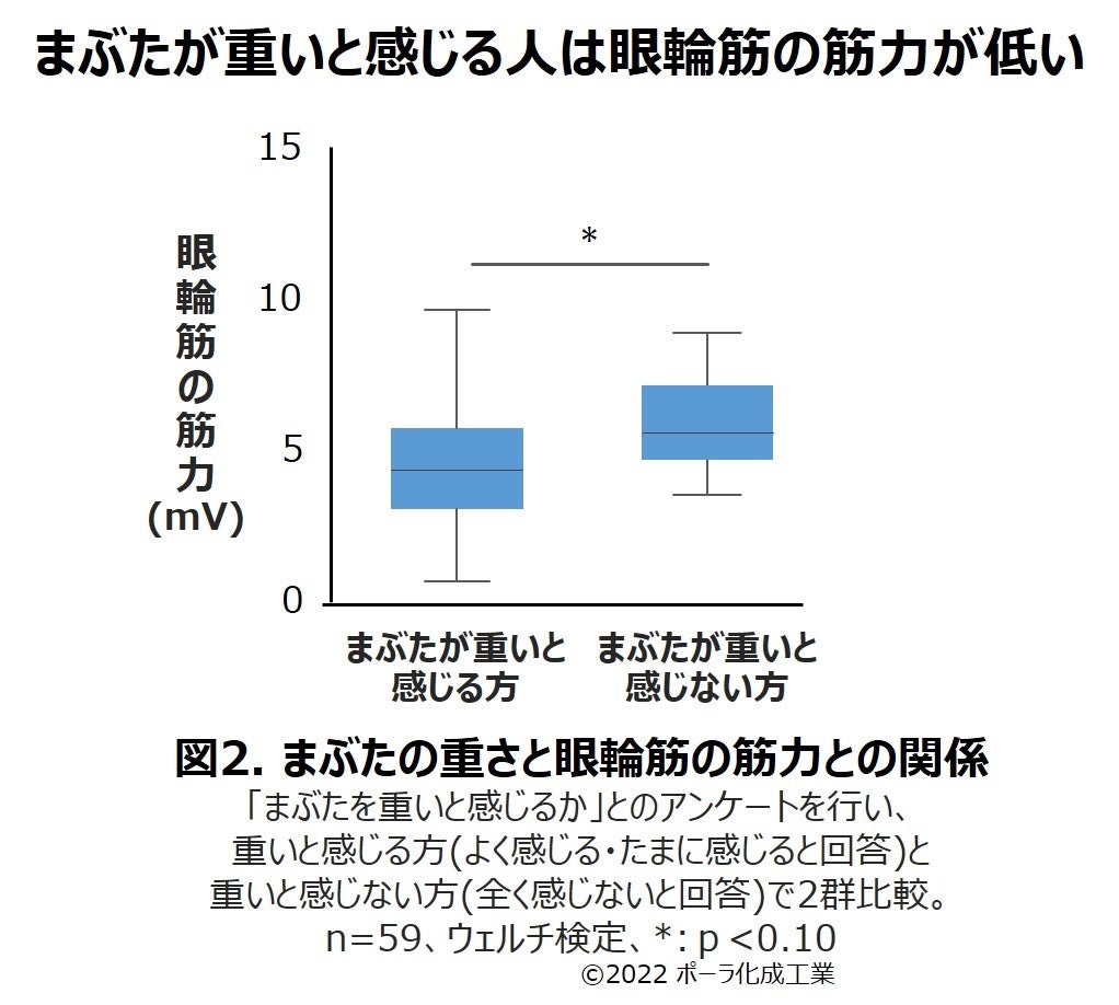 眼輪筋は目元の印象やドライアイなど目の機能にも関係していると考えられており、その筋力の低下はさまざまな影響を及ぼすと考えられます。そこで、筋力を測定した対象者に、さまざまな生活習慣や目元の悩みについてのアンケートを行いました。その結果、まぶたを重いと感じている人は、全くまぶたを重いと感じていない人と比べて目のまわりの筋力が低下していることが判明しました(図2)。