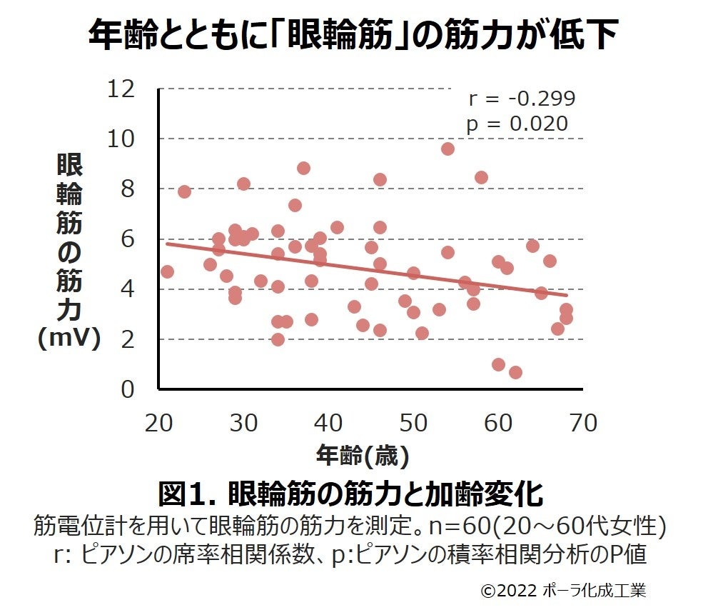 まず、筋力の加齢変化を把握しようと20〜60代女性60人を対象に眼輪筋の筋力測定を行いました。その結果、年齢とともに筋力が緩やかに低下していくことが分かりました(図1)。