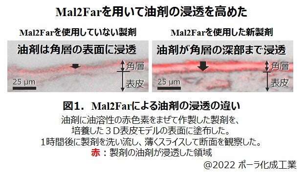これまでにポーラ化成工業では、高い乳化力と、細胞間脂質の構造に働きかけ角層への浸透を促進する作用を併せ持つ独自成分「Mal2Far」を開発し、さまざまな目的で活用してきました※1。本研究でも、ハリ油剤の乳化にMal2Farを用いることで、多量のハリ油剤を配合した新製剤を開発することに成功しました。また、油剤の浸透力が向上することも確認できました(図1)。
