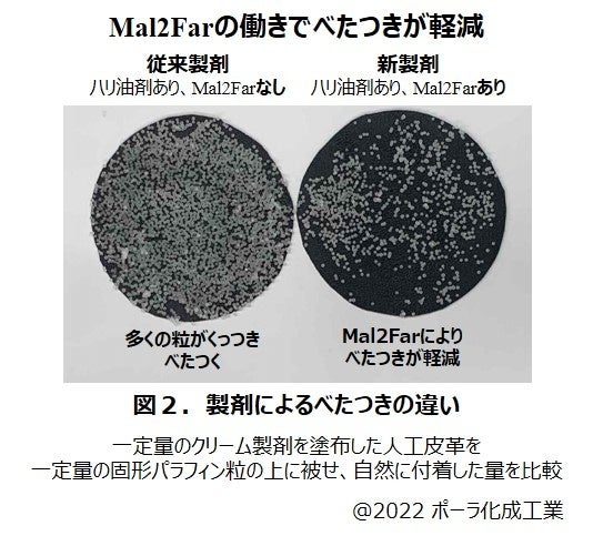 ハリ弾力とべたつき軽減の効果を計測及び官能評価をしました。機器を用いたハリ弾力計測では、Mal2Farを用いたクリーム製剤(新製剤)は、従来製剤に比べて肌の弾力を向上させる効果に優れていることが確認できました(補足資料1)。人工皮革を用いたべたつきの計測においても、従来製剤に比べて軽減することが確認できました(図2)。