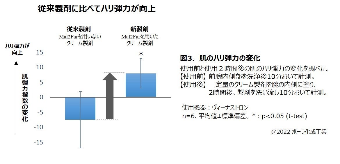 Mal2Farを用いた新製剤は、角層の細胞間脂質に作用し、ハリ油剤が浸透することで、肌のハリ弾力向上につながったと考えられます。