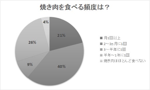続いて、90%以上の人が「焼き肉好き」とわかったので、「焼き肉を食べる頻度」についてもアンケートを行ってみました。すると、一番多かったのは、「2〜3ヶ月に1回」で40%でした。