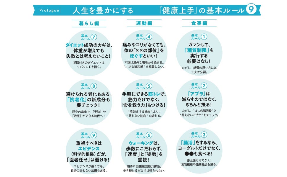 「基本ルール」は9つだけ! この9つの基本ルールを知っておくだけで、あなたも明日から「健康上手」に。基本ルール1の「ガマンして、”糖質制限” を実行する必要はなし!」から、基本ルール9の「重視すべきはエビデンス(科学的根拠) だが、”医者任せ” は避ける!」まで、意外に知られていない “健康情報のキモ” が、この1冊でマスタできます。