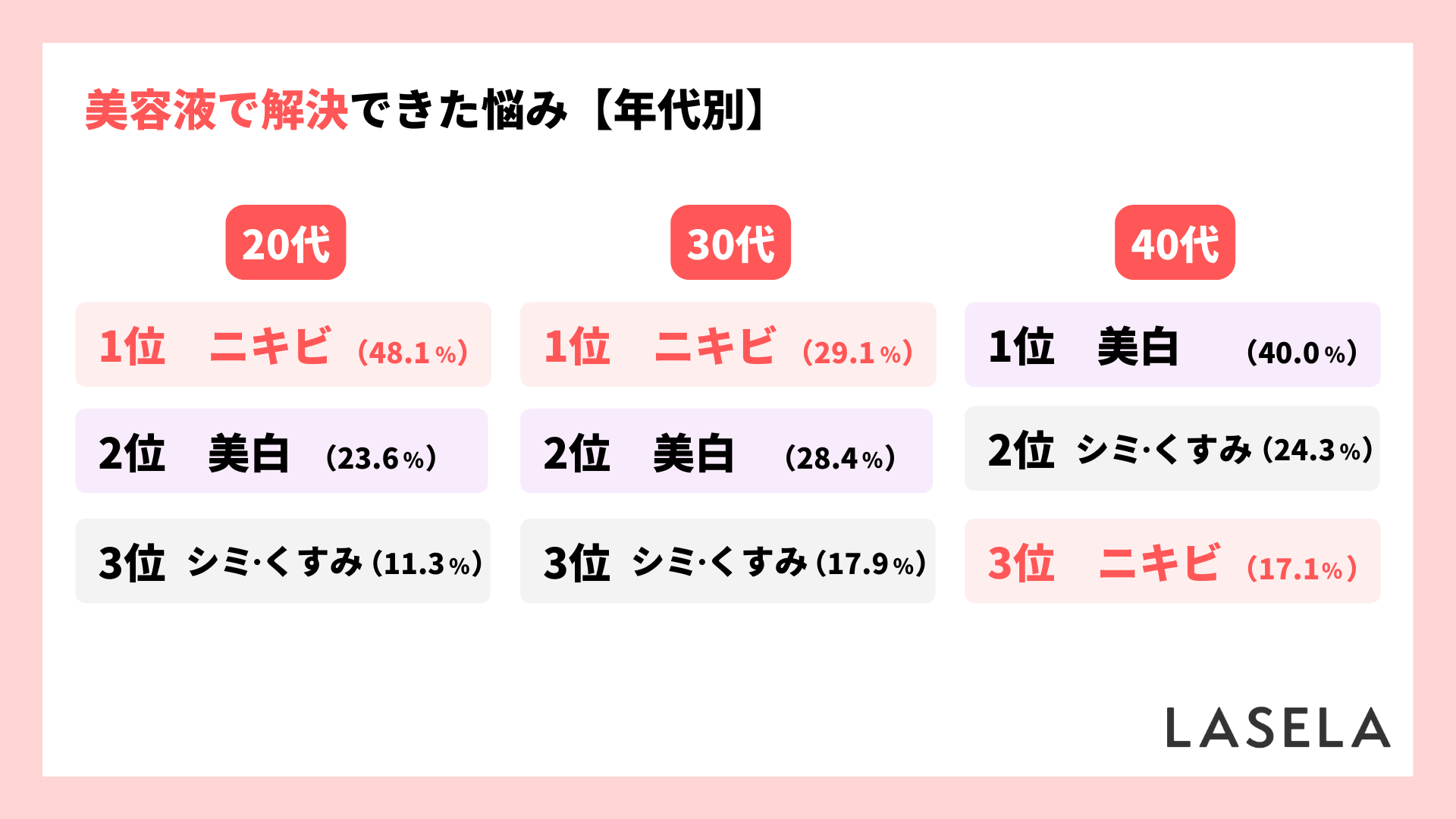 ■美容液によって解決できた悩み、20代は「ニキビ」、40代は「美白」がトップ