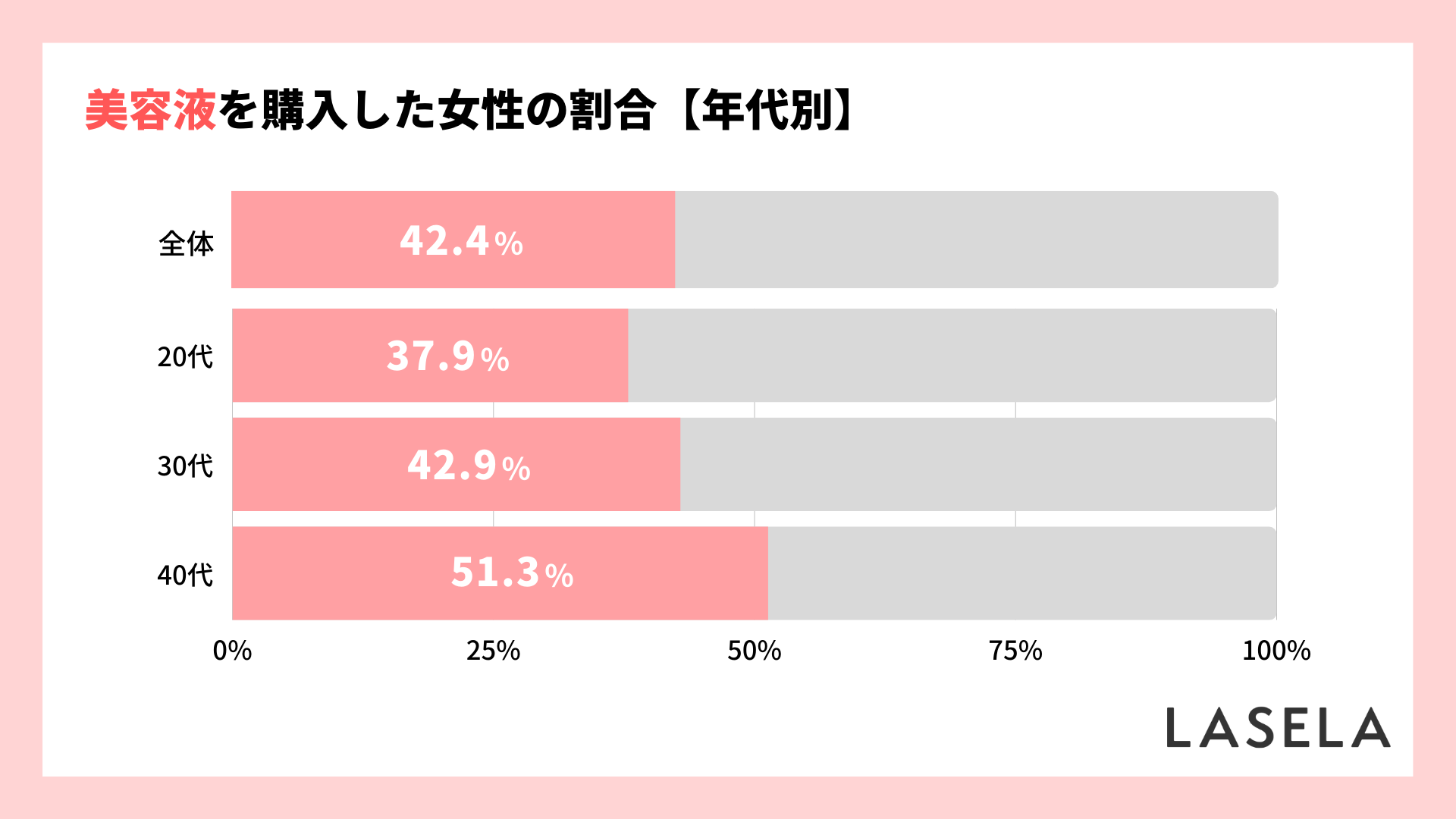 • 美容液を利用する割合は年齢とともに増加、40代女性の2人に1人が購入
