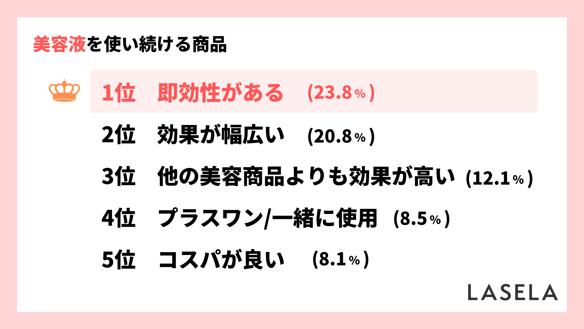 その他にも、「いつものスキンケアに手軽にプラスできる」「集中的にケアしてくれる」「少量で効果を実感できコスパが良い」などが理由として挙げられました。