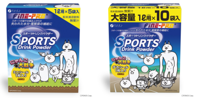 ファインでは、簡単に素早く水分補給ができるだけでなく、エネルギーや栄養素の摂取もできる「スポーツドリンクパウダー」を発売しております。毎日気兼ねなく使用していただけるようカロリーは控えめな点からも、お子様のいるご家族や、スポーツをする方、健康を気にされる方など、幅広い層から支持されている商品です。 今回発売する新パッケージでは、商品を選ぶ際にも楽しんでいただきたい、お子さまにより愛される商品になってほしいという思いから、大人気スマホゲームアプリ『にゃんこ大戦』とコラボレーションいたしました。パッケージには『にゃんこ大戦争』で登場する人気キャラクターがデザインされています。