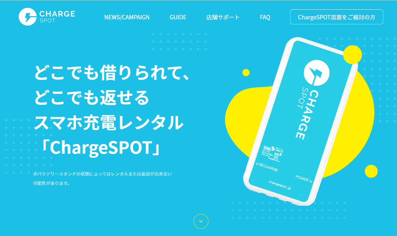 日本設置台数シェアNo.1※の「ChargeSPOT」はモバイルバッテリーを「どこでも借りられて、どこでも返せる」をコンセプトに2018年4月からサービスを開始し、全国の駅、空港、商業施設や飲食店、コンビニエンスストア、公共施設などを中心に現在約30,000ヶ所まで設置場所を拡大しています。
