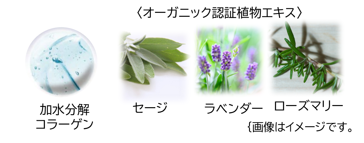 保湿成分として「加水分解コラーゲン」や、オーガニック認証植物エキス(セージ葉エキス/ラベンダー花エキス/ローズマリー葉エキス)を、贅沢に配合しています。