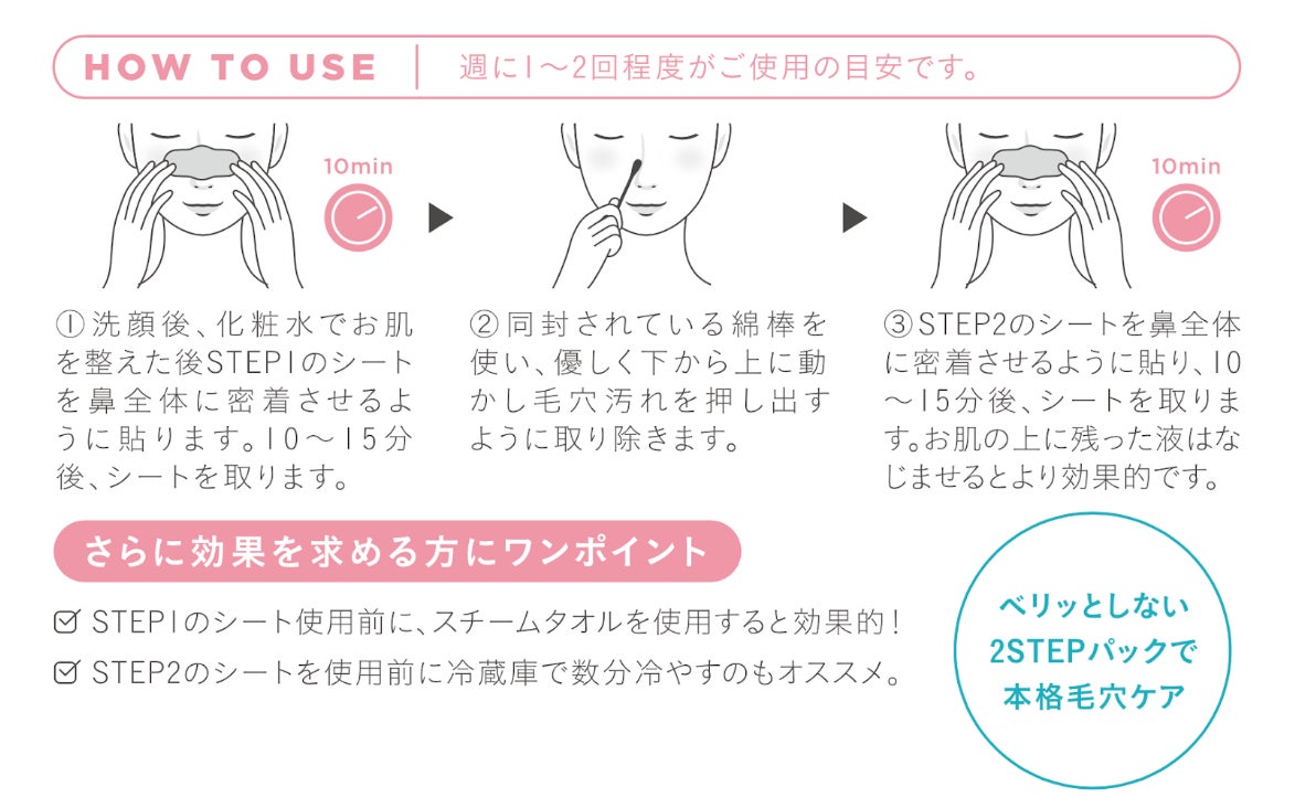 従来の鼻パックとは違い、粘着しないタイプの鼻パック。肌に負担をかけない新しい毛穴ケア商品です。毛穴汚れを溶かしたあと、保湿でしっかり肌を労る2ステップ式で簡単かつ本格的な毛穴ケアが自宅で手軽に楽しめます。