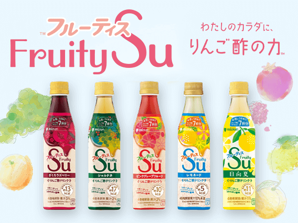 フルーティーさにこだわったりんご酢ドリンクMizkan「フルーティス™️」。お酢を身近に、手軽に楽しんでもらえるよう、フルーティーな飲みやすさにこだわっています。「ざくろラズベリー」「シャルドネ」「ピンクグレープフルーツ」「レモネード」 「日向夏」の5種の味わい。カロリーひかえめ※でやわらかな酸味とほどよい甘み。水や炭酸水 、牛乳など、色々な割り方で楽しめます。