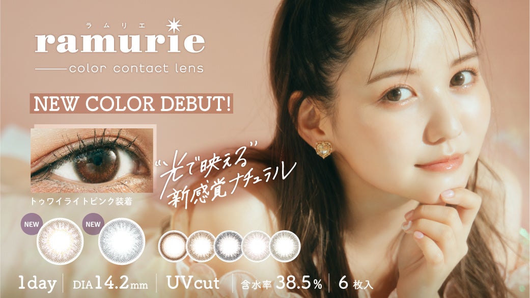 『ramurie』から新色2色発売します。カラコン初心者からちょっと小慣れた方が使ってくれたらいいなと思っています。新色の「トゥワイライトピンク」は、既存カラーの「コメットピンク」よりもしっかりピンクがでるけど、ナチュラルに仕上がっています。「ティアーグレー」はレンズを見ると結構ブルーなんだけど、つけたら紺とかブルーグレーの自然な発色で割と新しいタイプのグレー。光が入ると本当にキラキラしてかわいいので、みんないっぱい使ってください。