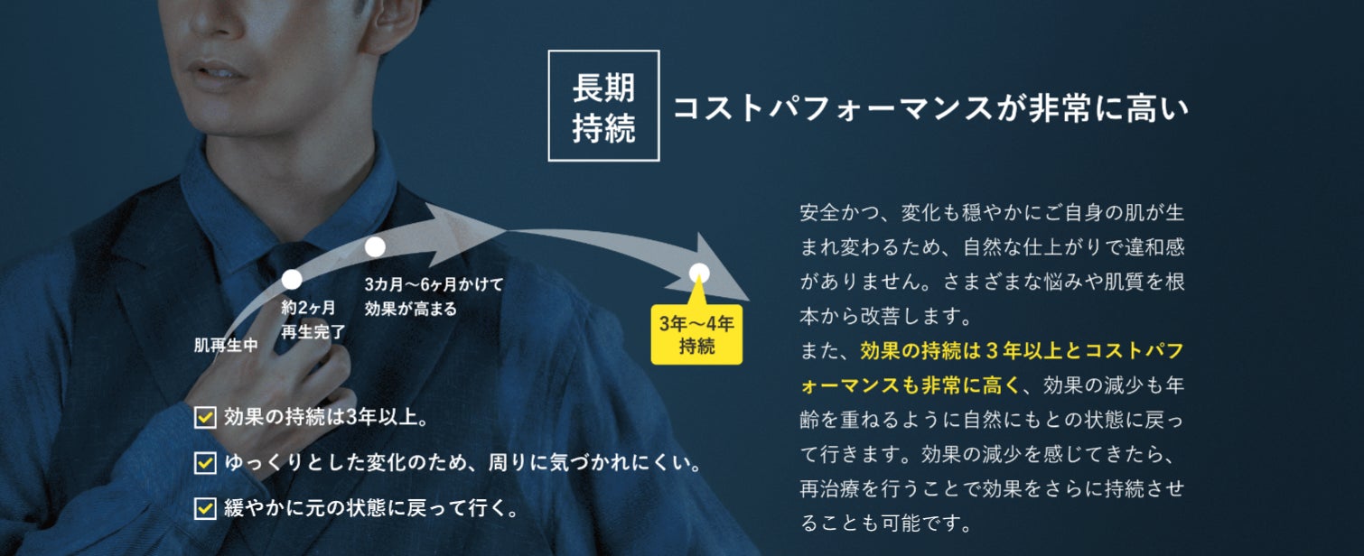 PRPによる肌再生療法は仕上がりが自然であり、周りに知られづらく、最大限の美容効果を得られることも大きなメリットになります。また、効果の持続は3年以上とコストパフォーマンスも非常に高く、効果の減少も年齢を重ねるように自然にもとの状態に戻って行きます。効果の減少を感じてきたら、再治療を行うことで効果をさらに持続させることも可能です。