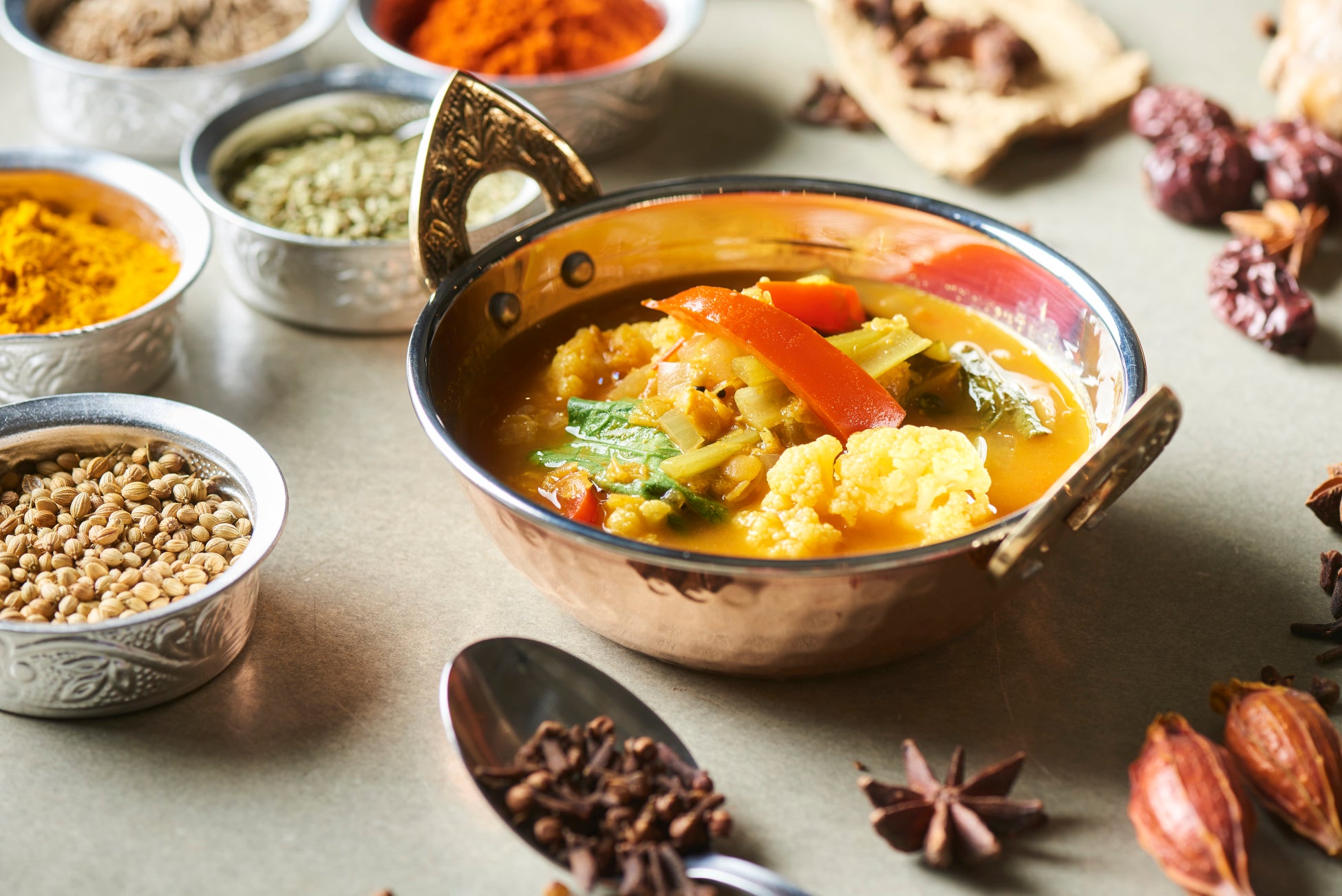 香辛料と香り高い野菜で晴れやかな気分になる豆ベースのカレーです。