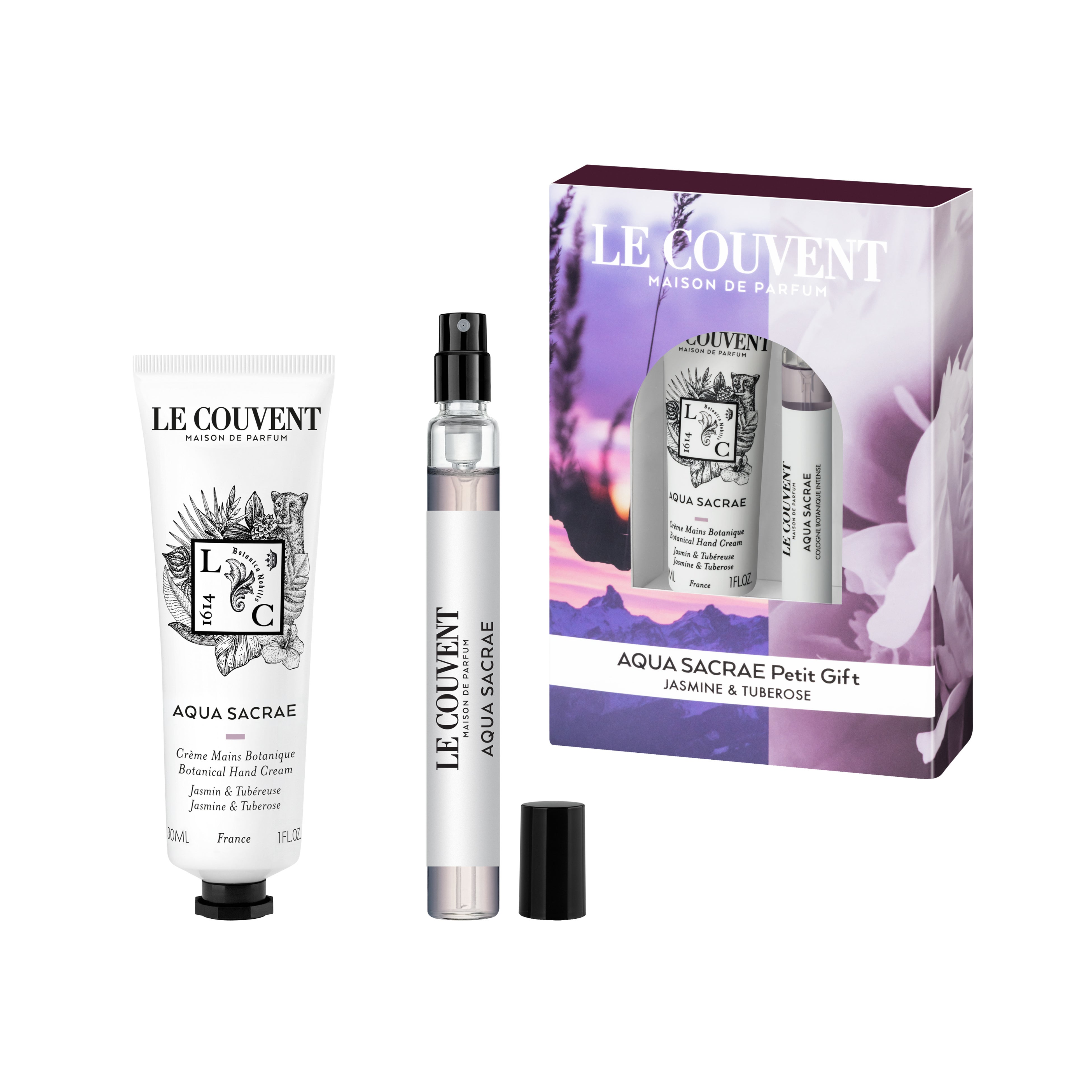 ミニム修道院の白いお花の庭園での夕暮れを思わせる、パウダリーフローラルな香り、アクアサクラエのボタニカルコロンとハンドクリームのギフトセット。